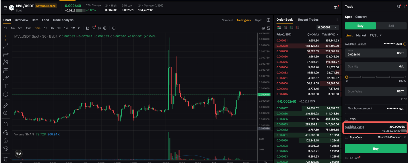 For illustration, the order quota for MVL is 300,000 USDT, and the market price is 0.002640. The maximum quantity users can buy from the Spot market is 113,636,363 MVL (300,000/0.002640). Once this quota is reached, only sell orders are allowed. Any value increase due to deposits or price changes after reaching the quota isn't restricted. You can view the order quotas on the spot trading order window.