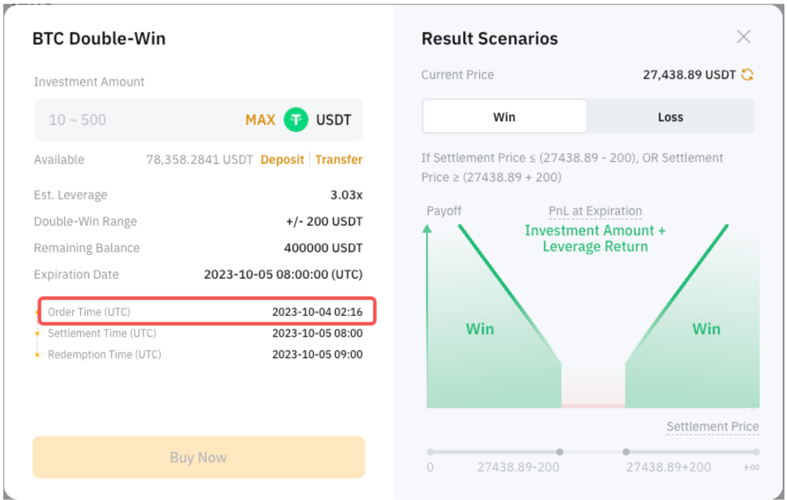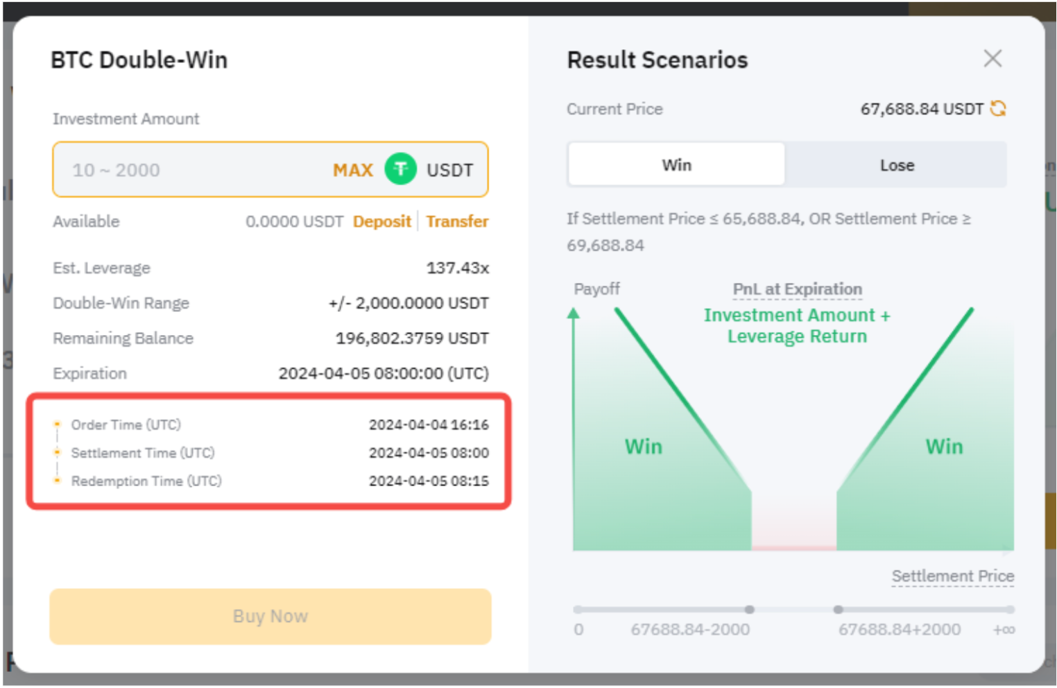 Profits will be credited to your Funding Account 15 minutes after your Double-Win plan settled. For example, the settlement time is T+1 8AM UTC, and you will receive the payoff plus the initial investment amount on T+1 8:15AM UTC. For precise details, please refer to the information available on the order page.