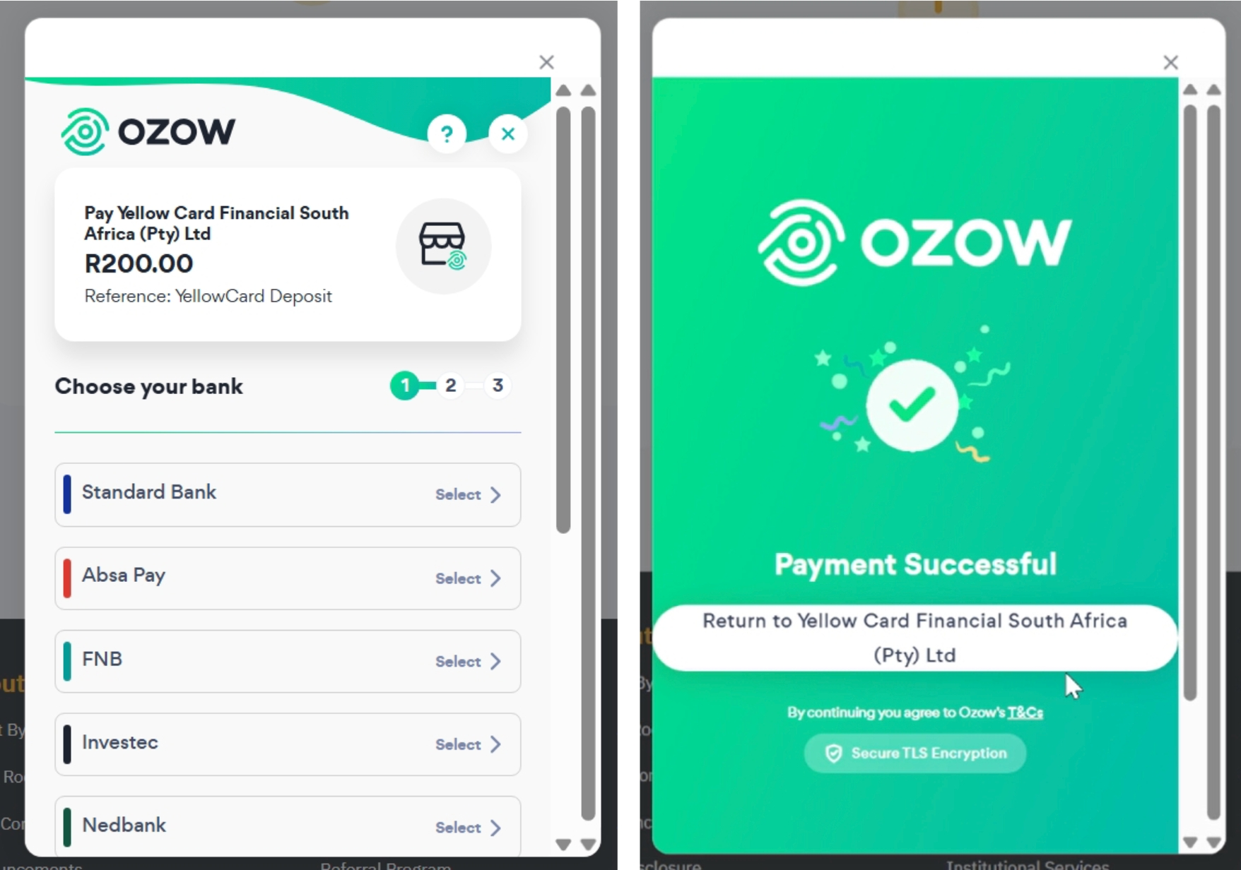 Step 5: After confirming the order, you will be directed to OZOW. Select your bank, log in, grant OZOW access to your account, and authorize the transaction. Please note that the account must be under the same name as your Bybit account. Your information stays encrypted and protected.
