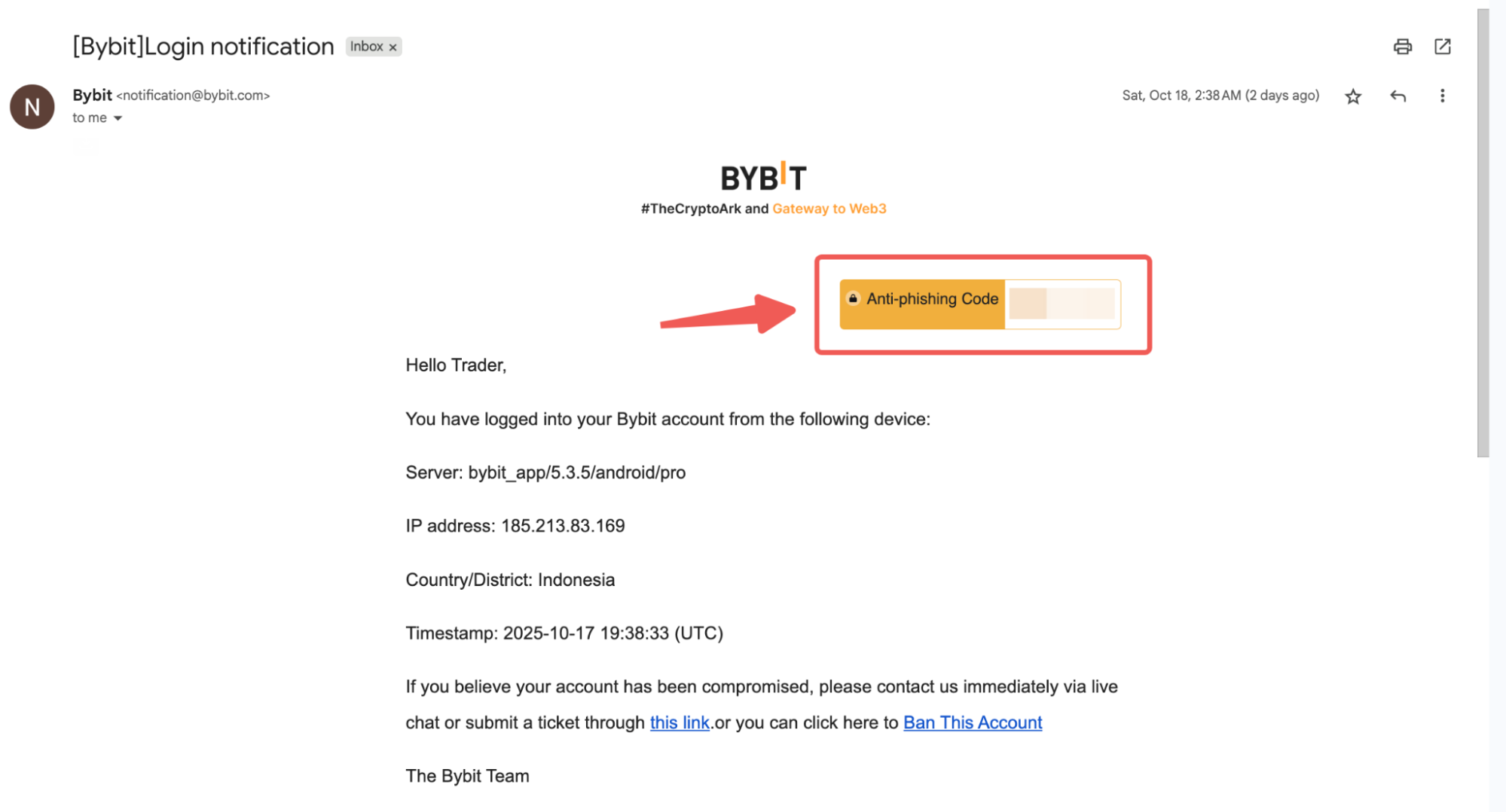 Bybit’s Anti-Phishing Code is a security feature comprising a unique set of alphanumeric and special characters. Once activated, this personalized code would appear in all official Bybit emails and text messages thereafter, allowing users to easily verify the authenticity of information they receive.