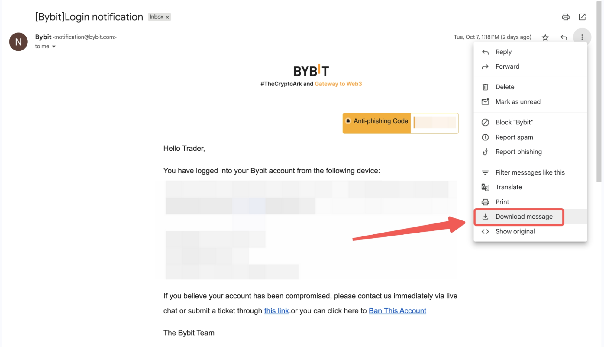 As mentioned above, even if the verification result is official, the sender’s contact information can be easily forged using spoofing techniques. Below is a typical example demonstrating how scammers conceal and forge sender email addresses to solicit assets from Bybit users.
