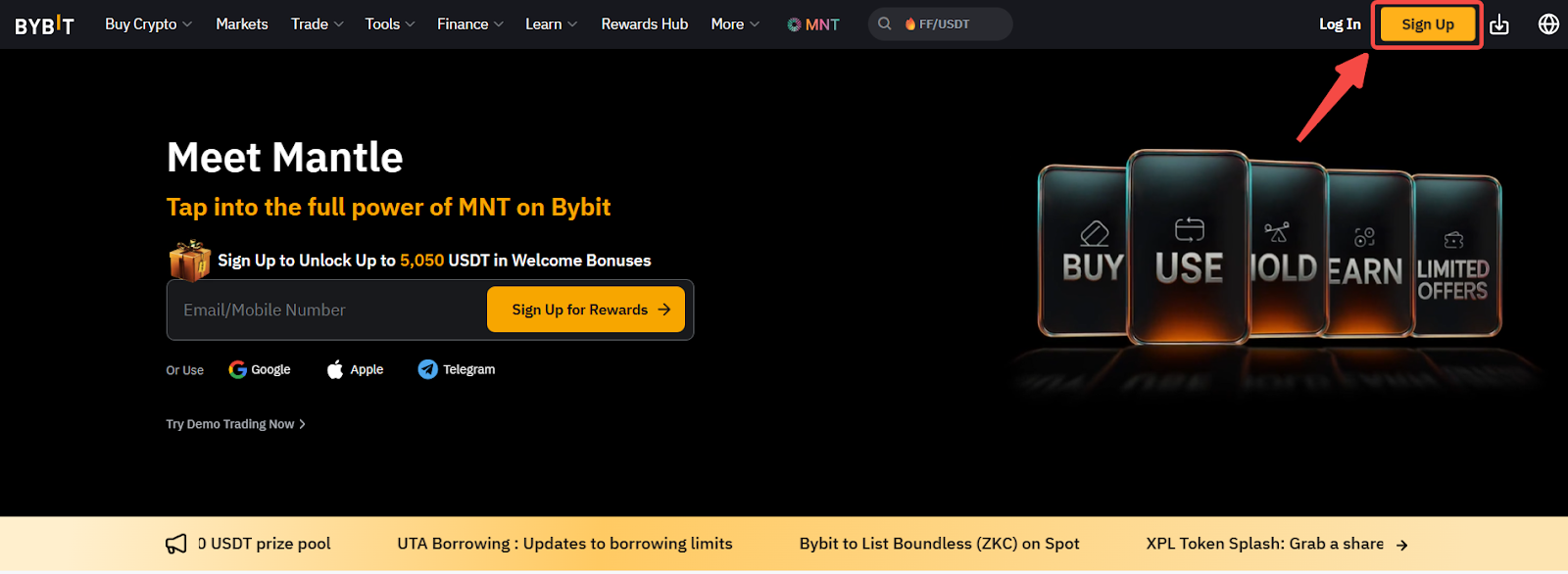 Step 1: On the Bybit website homepage, click on Sign Up in the top right corner to access the Sign Up page.
