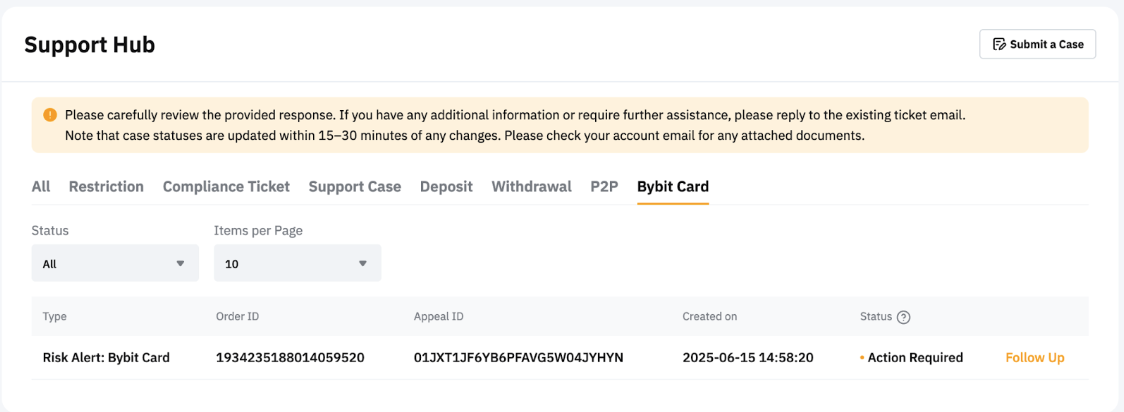 Note: Bybit will make the final decision based on the information and evidence you provide. If your dispute is rejected, you will be notified via email. Kindly be aware that you cannot submit a second chargeback request for the same transaction.