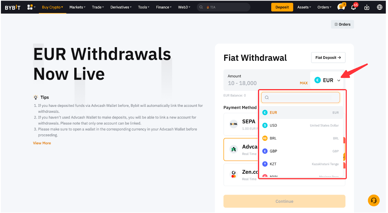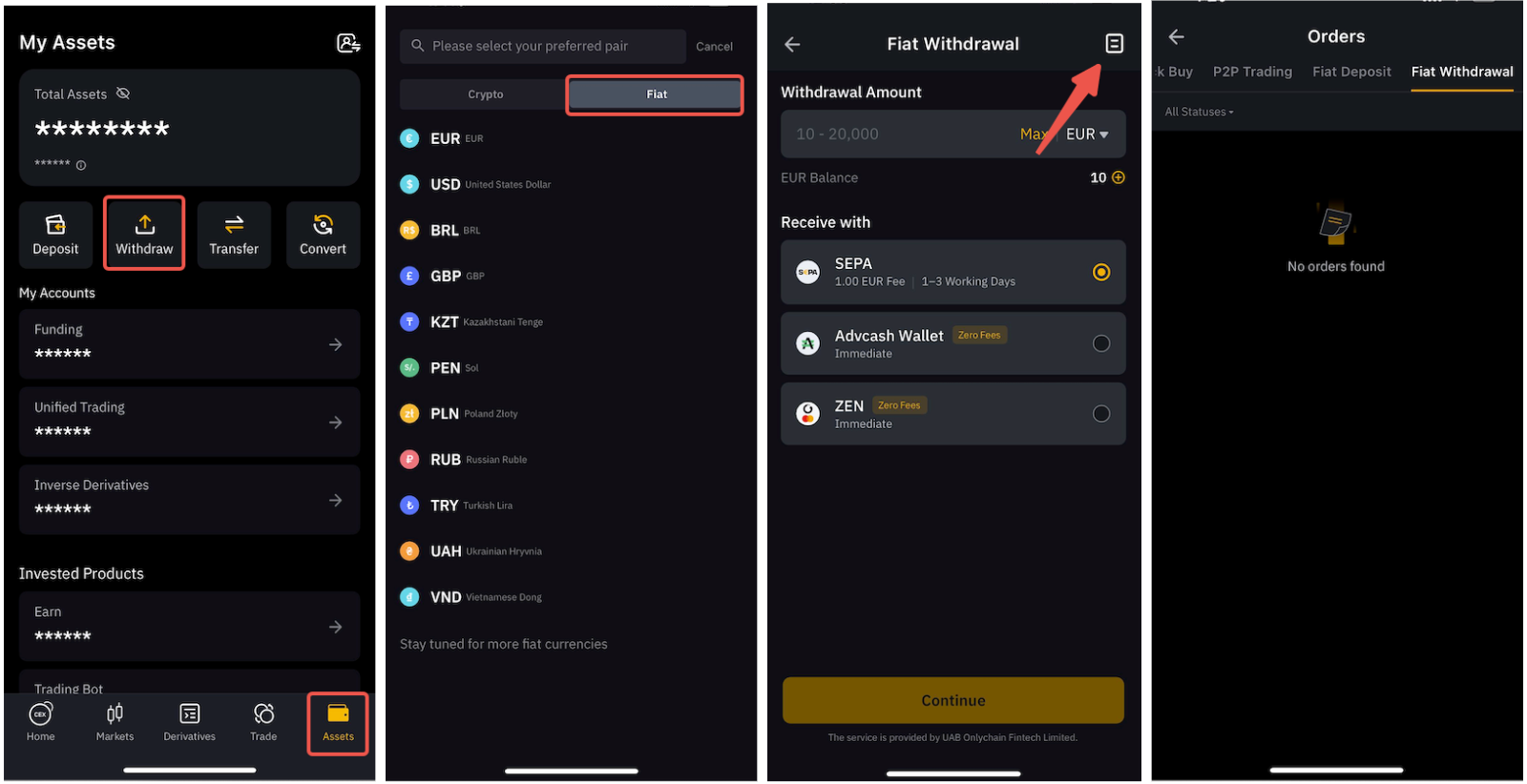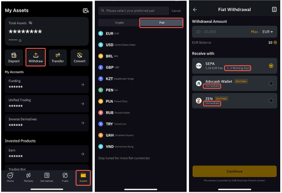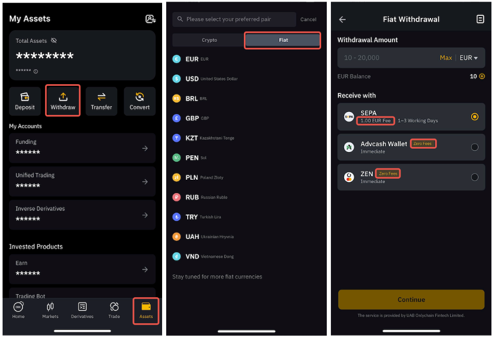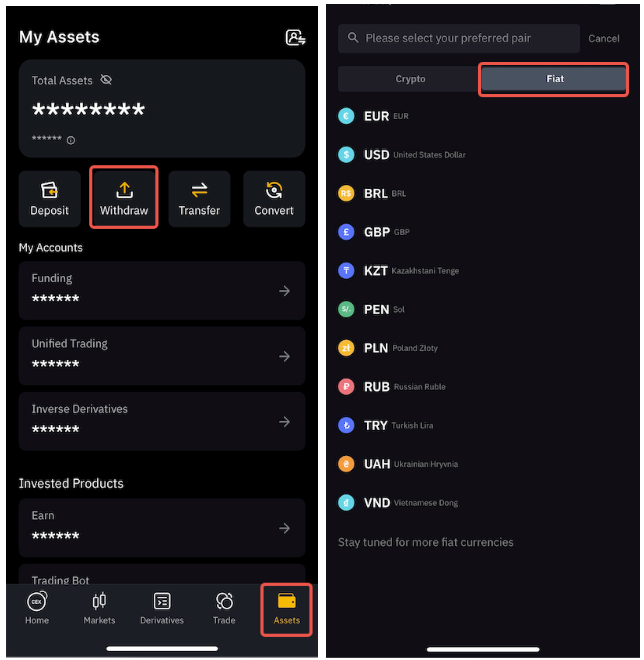 En la aplicación, vaya a la pestaña Activos y pulse sobre Retirar, después vaya a la sección Fiat para acceder a la lista de opciones admitidas.
