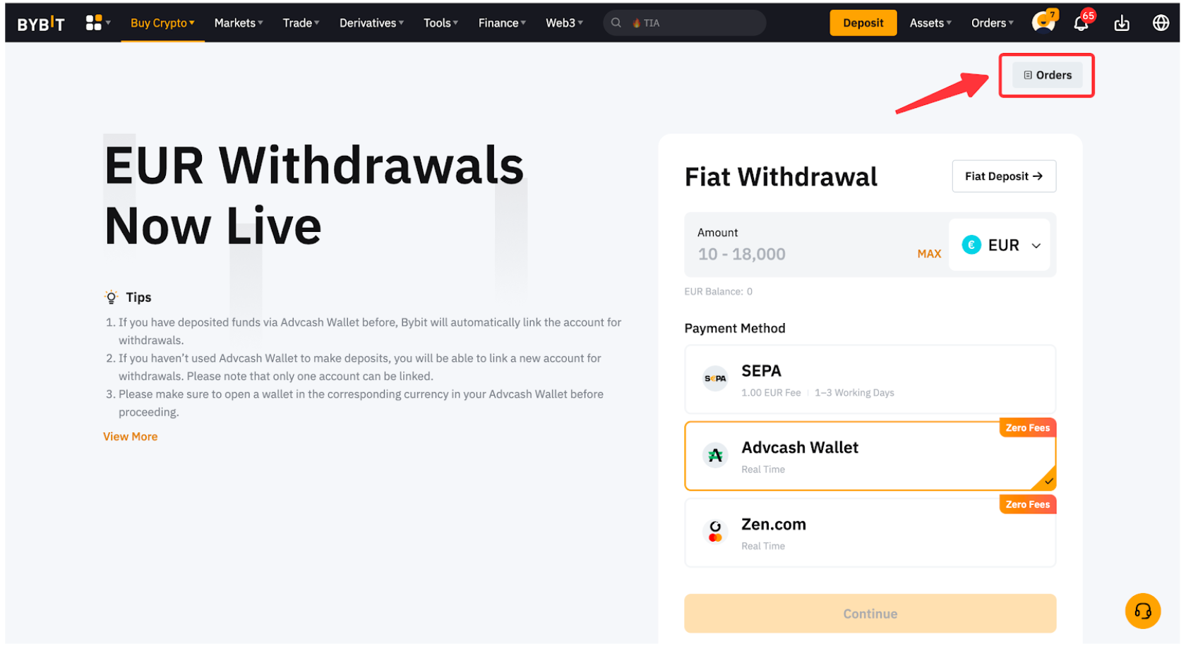 Para ver tu historial de retiro de divisa fiat, haz clic en Órdenes en la esquina superior derecha para obtener más información dentro de la página de Retiros Fiat.