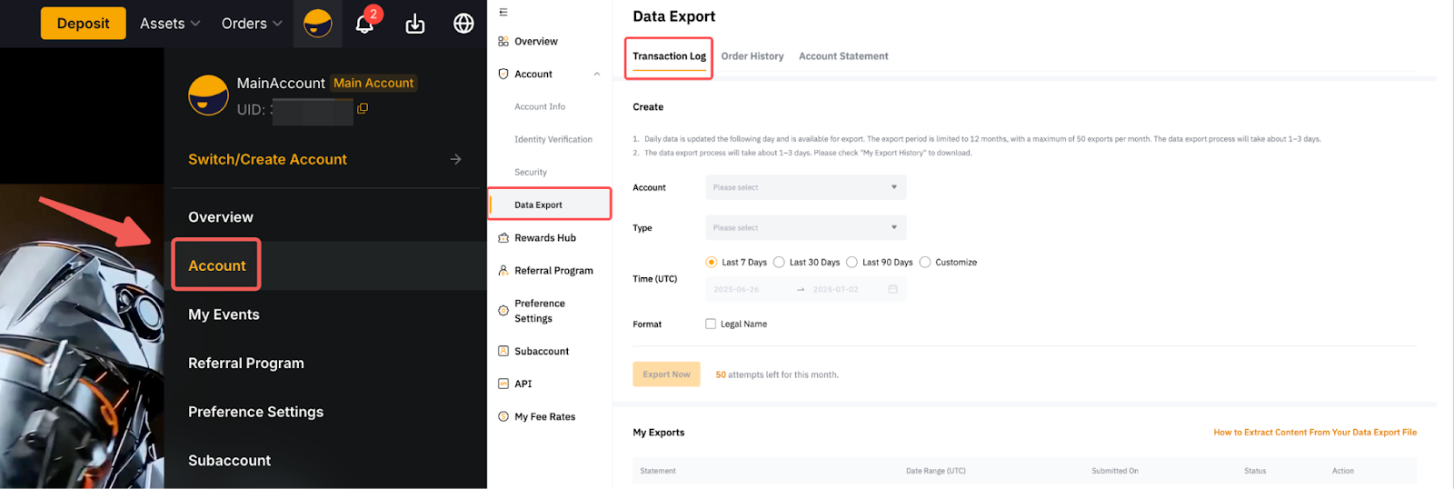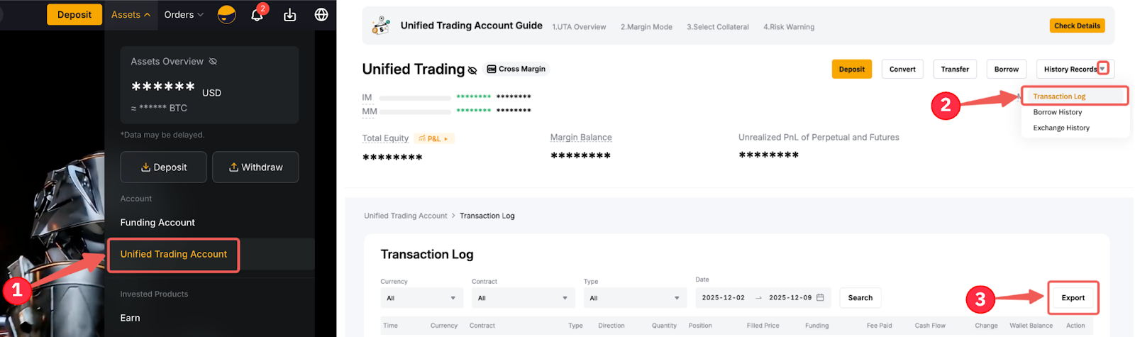 Step 1: You can also export the transaction log via your Unified Trading Account. To do so, go to Assets Unified Trading Account → History Records → Transaction Log → Export.