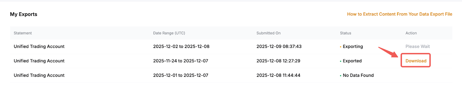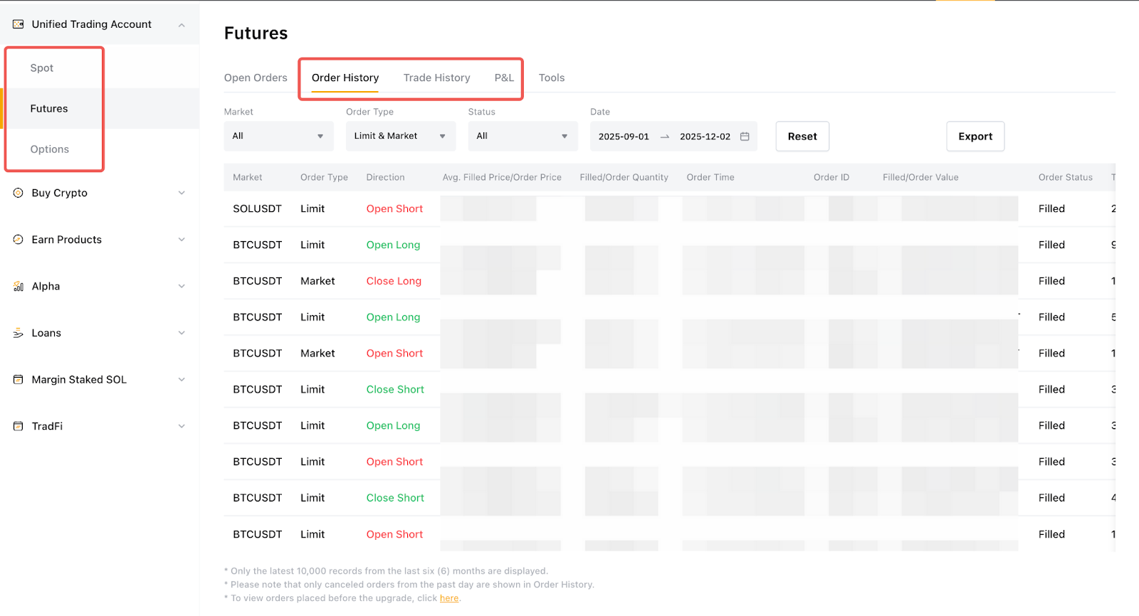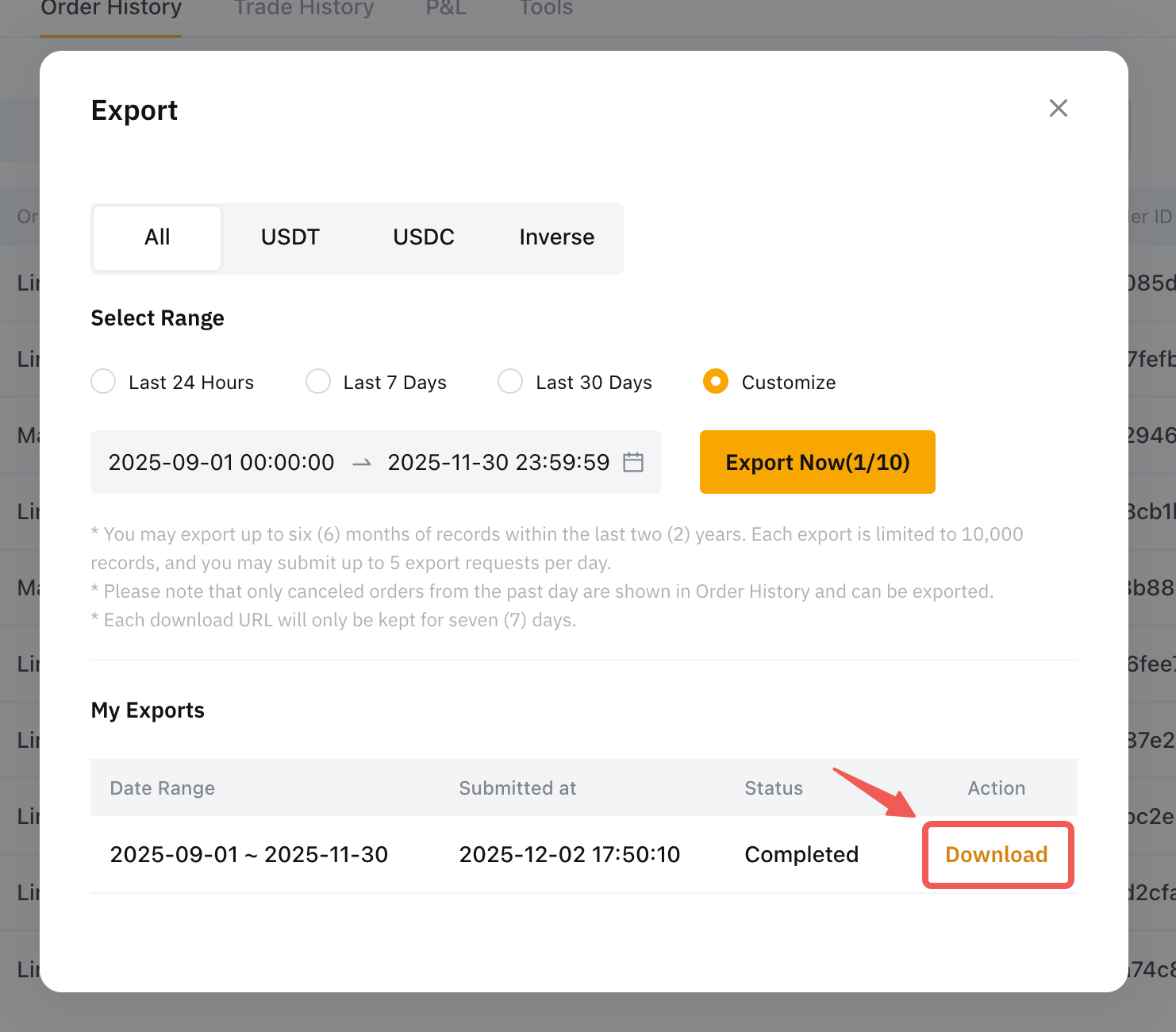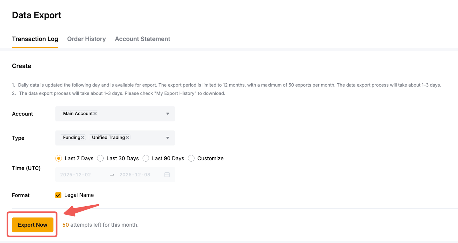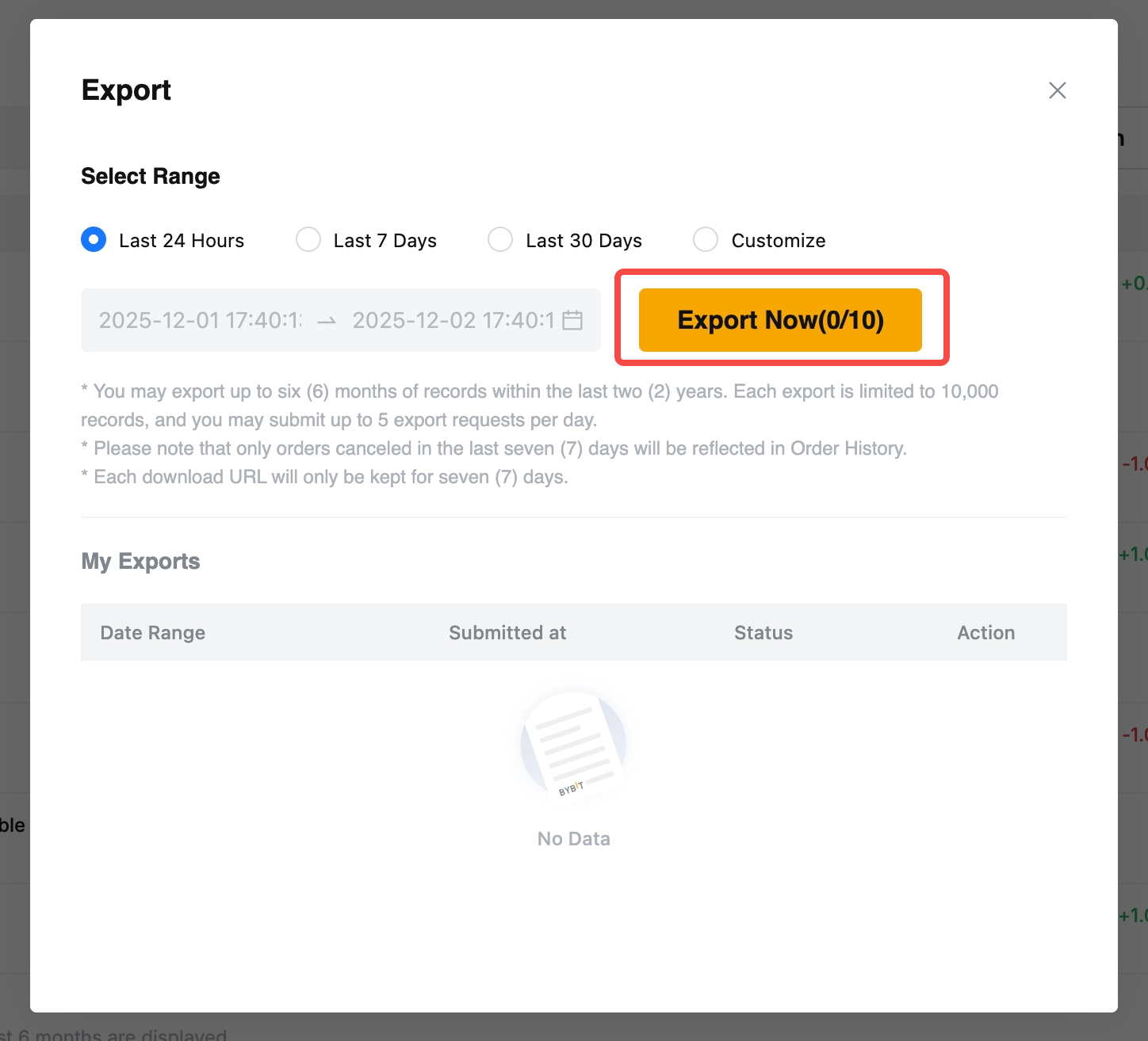2. Each export is limited to 10,000 entries, and you may submit up to ten (10) export requests per day for Spot Orders and up to five (5) export requests for Derivatives Orders.