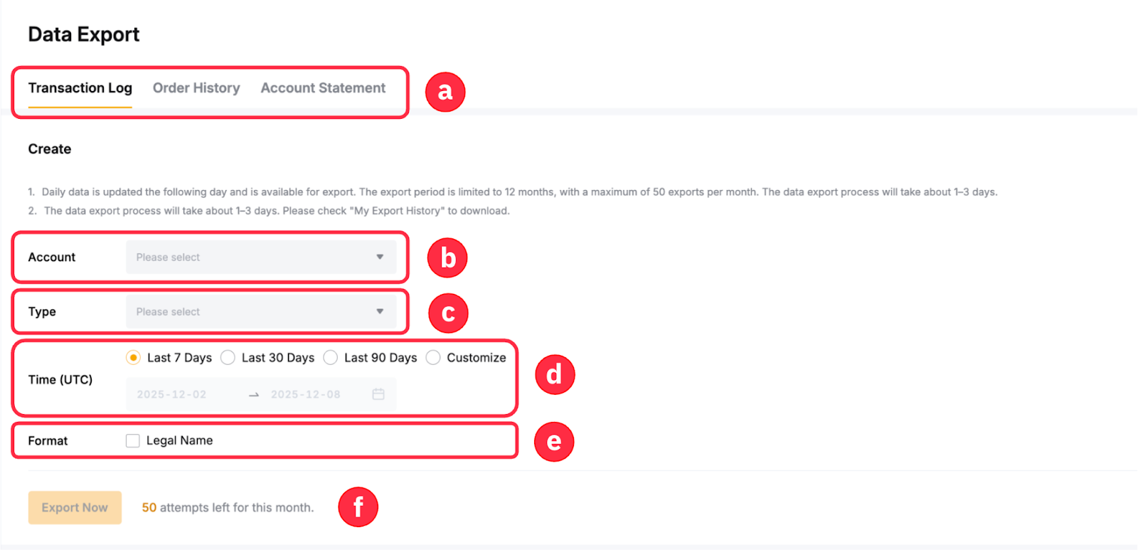 2. Up to three (3) years of recent data can be retrieved. However, the export period is limited to one year (12 months), with a maximum of 50 exports per month for all the data types. For example, if you have requested data export for both Transaction Log and Account Statement, you will have 48 remaining exports within that month.