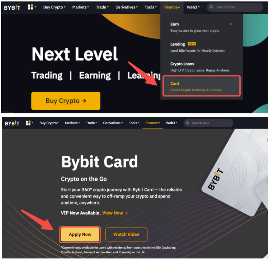 1o passo: Vá para Finanças → Cartão. Clique em Ordem nova no banner físico de inscrição do cartão Bybit.