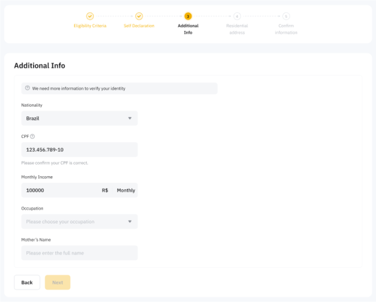 5o passo: Forneça informações adicionais sobre sua nacionalidade, CPF, renda mensal, nome da mãe e ocupação.
