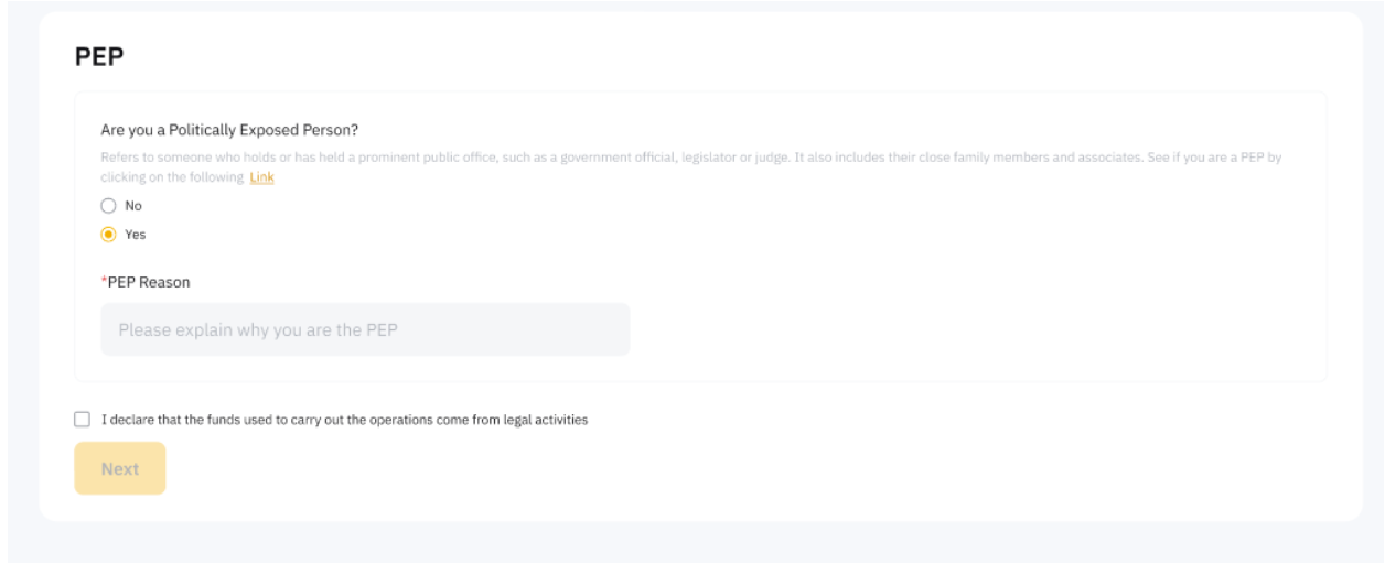 4o passo: Preencha a declaração de PEP e reconheça que os fundos usados para realizar as operações são provenientes de atividades legais.