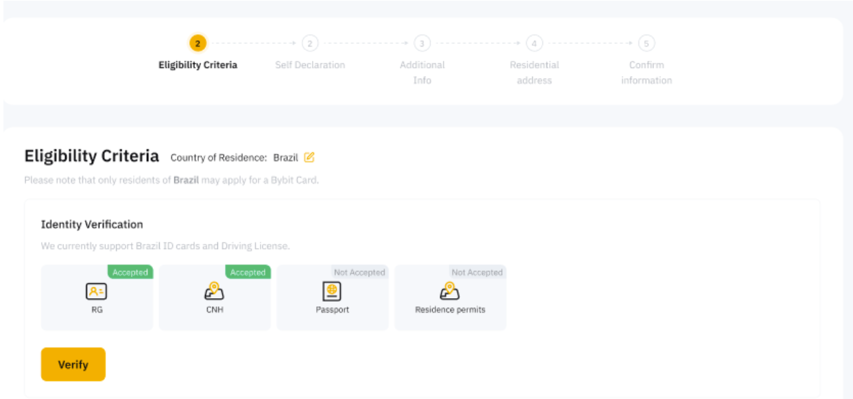 Observação: O Cartão Bybit tem requisitos mais rigorosos para a verificação de identidade. Portanto, você pode precisar atualizar sua verificação de identidade, mesmo que já a tenha concluído em sua conta Bybit anteriormente.