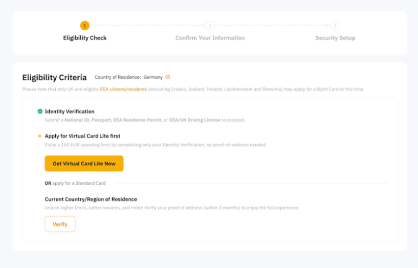 Antes de iniciares o teu pedido a um Cartão Virtual Bybit Lite, certifica-te de que és elegível e que cumpres os seguintes critérios: