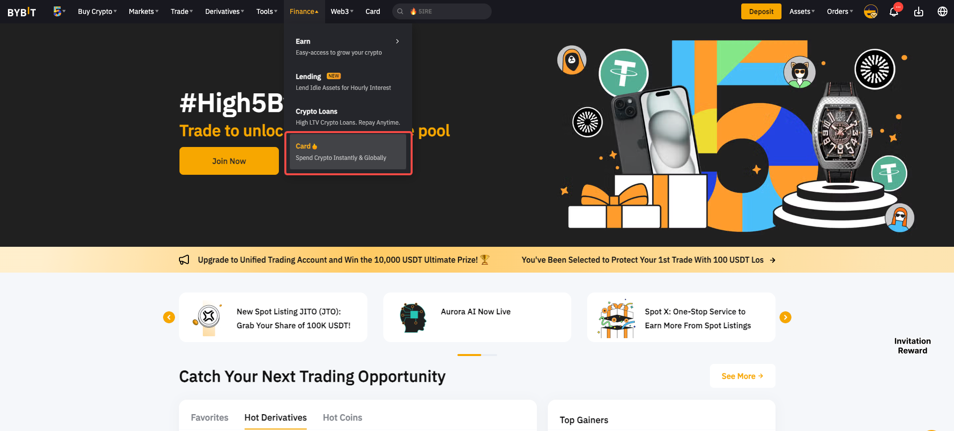 Passo 1: Acede à barra de navegação da página Bybit, clica em Finanças e seleciona Cartão para entrar na página de pedido do Cartão Bybit. Clica em Saber mais ao lado de Versão Lite disponível para iniciares o teu pedido do Cartão Virtual Bybit Lite.