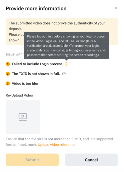 Passo 2: Você será solicitado a reenviar um vídeo com as informações solicitadas. A respectiva solução pode ser encontrada quando você passa o mouse sobre o ícone de ponto de interrogação.
