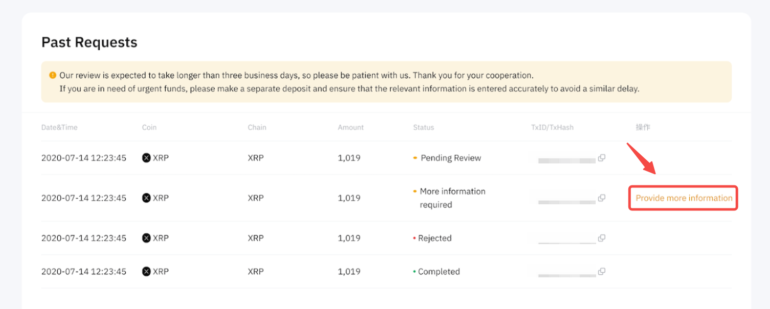 d. Mostrar TXID de reembolso total ou redirecionar para blockchain - Caso a plataforma de troca externa não mostre TXID de reembolso total na página de histórico, mas um link redireciona para o blockchain, clique no link e mostre-nos as informações no blockchain.