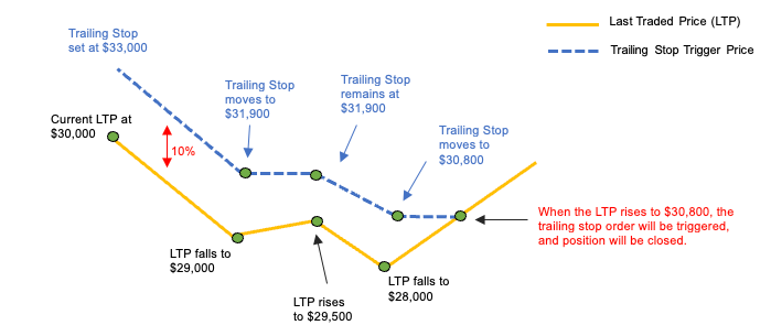 1. Если цена последней сделки опустится ниже 30 000 USD, то Трейлинг стоп-ордер активируется на уровне 33 000 USD, аналогично обычному стоп-лоссу.