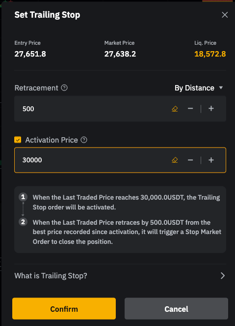 Шаг 2. Укажите 500 USDT в поле Коррекция и 30 000 USDT в поле Цена активации. Проверьте все детали и нажмите Подтвердить.