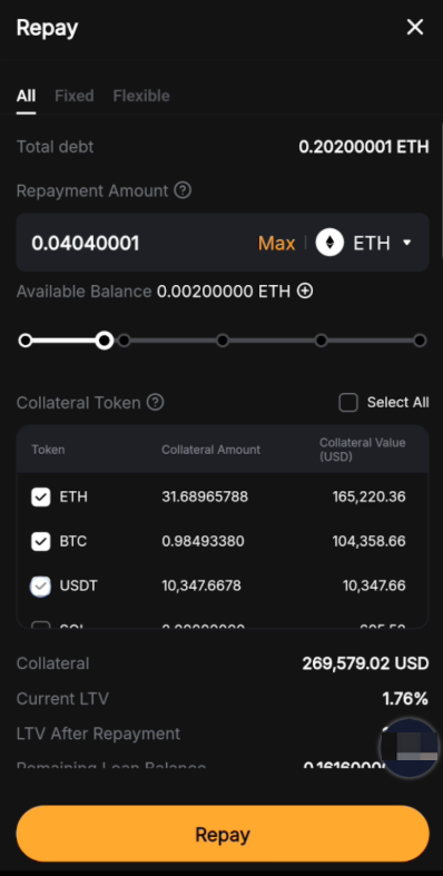 强平:如果 LTV 达到强平 LTV (95%),您的抵押品将被强平,以全额偿还贷款和任何应计利息。