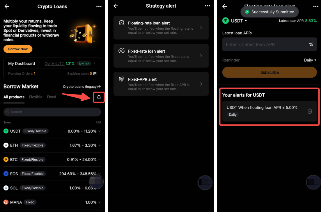 可以,您可以登录 Bybit App 设置质押借币贷策略提醒。请前往质押借币,点击钟形图标,选择策略提醒类型(浮动利率、固定利率或固定利率存币),选择代币,并设置利率,以便在利率达到或低于目标时接收通知。