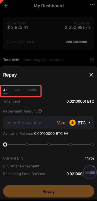 对于定期借币,您可以选择启用自动偿还或转为活期借币。