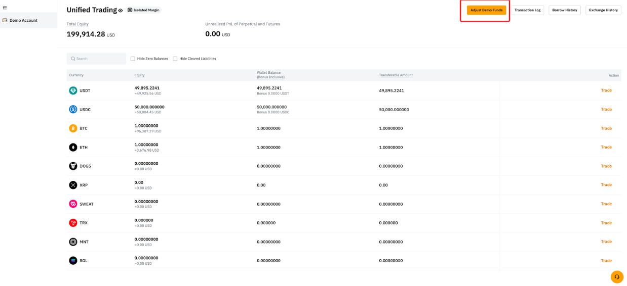 您的 Bybit 模拟账户完成初始化后,您将自动收到 50,000 USDT、50,000 USDC、1 BTC 和 1 ETH 的模拟资产,无需手动申请资金。