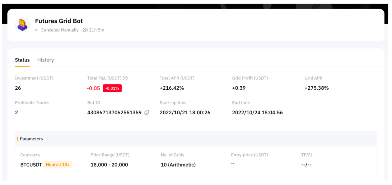 当您的网格机器人运行时,所有利润都将保留在机器人内。一旦机器人终止,您的投资金额和利润将自动转移到您的资金帐户。