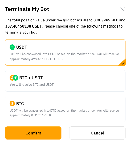 当您的网格机器人运行时,任何利润都将保留在机器人内。机器人终止后,您的投资金额和利润将自动转入您的资金帐户。