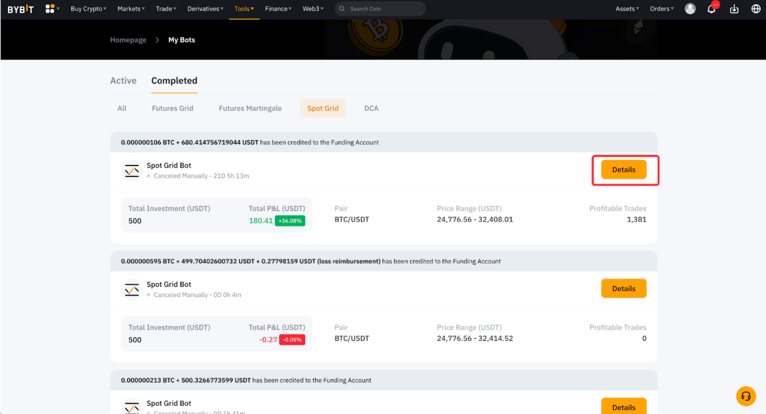 在 Bybit 网站上,请前往我的机器人查看所有运行中与已完成的机器人。点击特定机器人的详细资讯以存取其详细资讯。