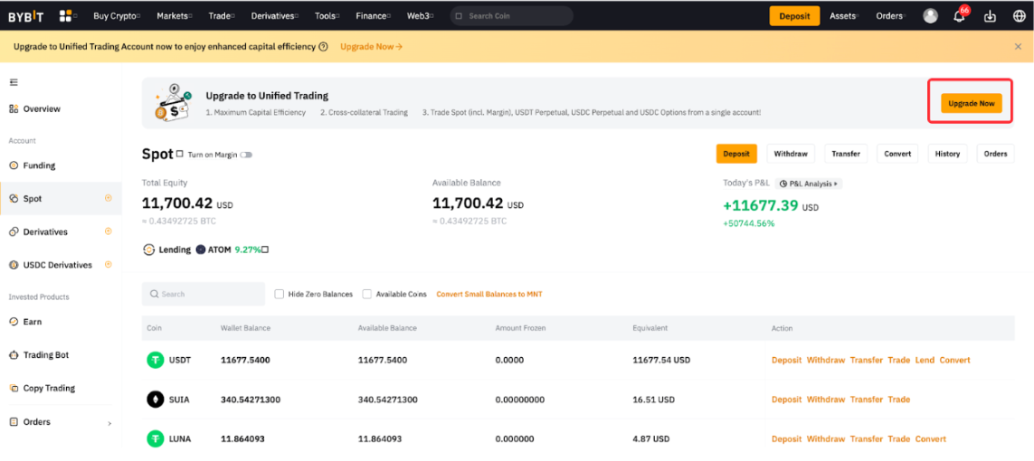 升级为 UTA 后,现货账户将并入统一交易账户,您只需将资产转入统一交易账户即可进行现货、现货杠杆或杠杆代币交易。如需充值或提币,请前往资金账户。