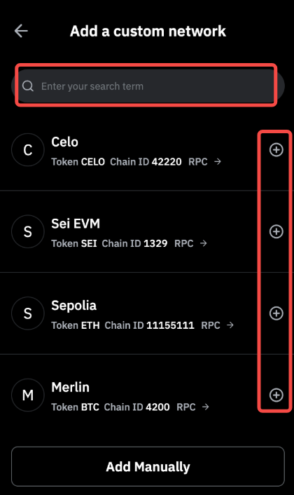 第 2 步:请输入有效的网络名称,找到网络后,点击 + 图标将其添加到钱包。