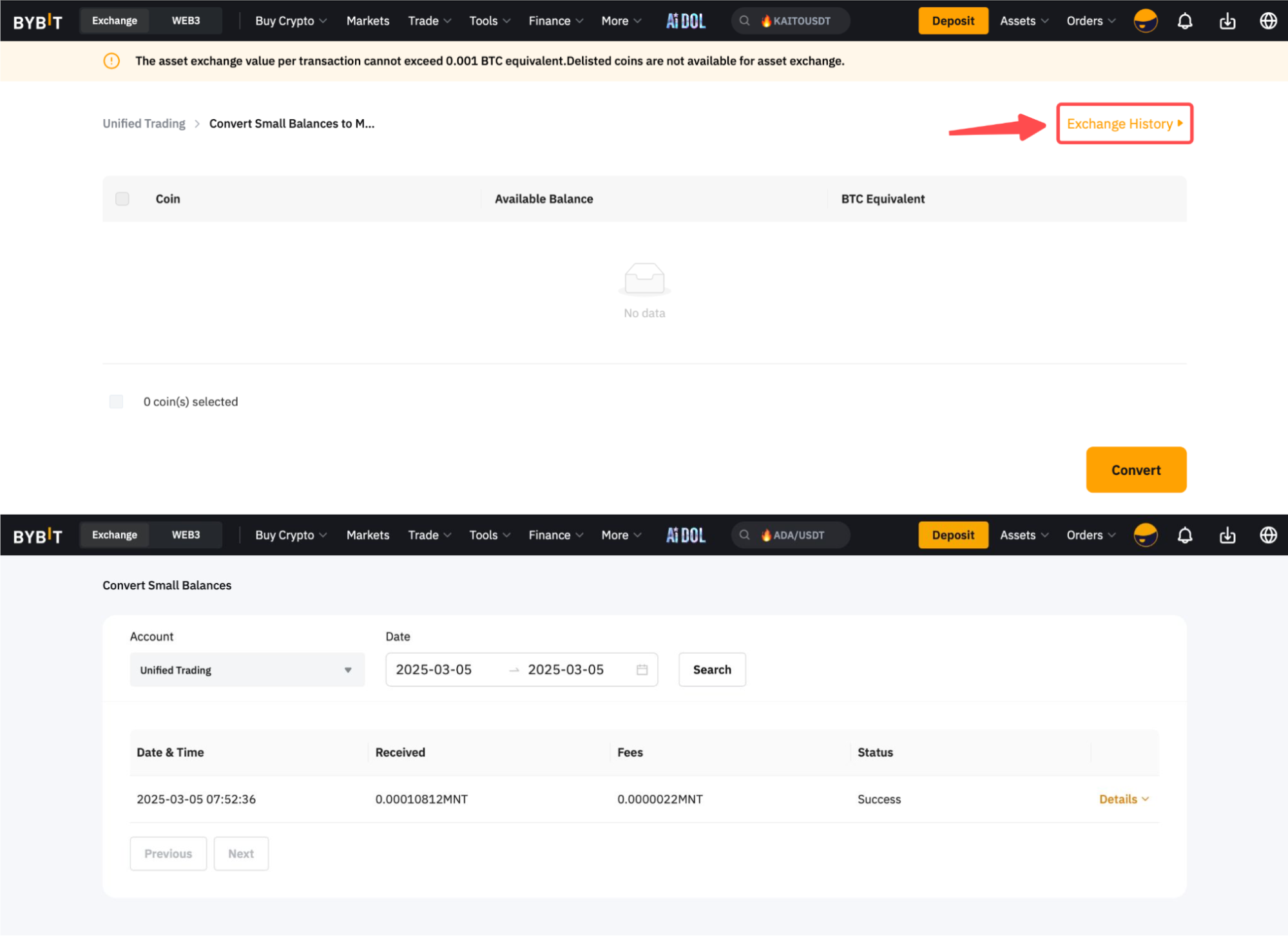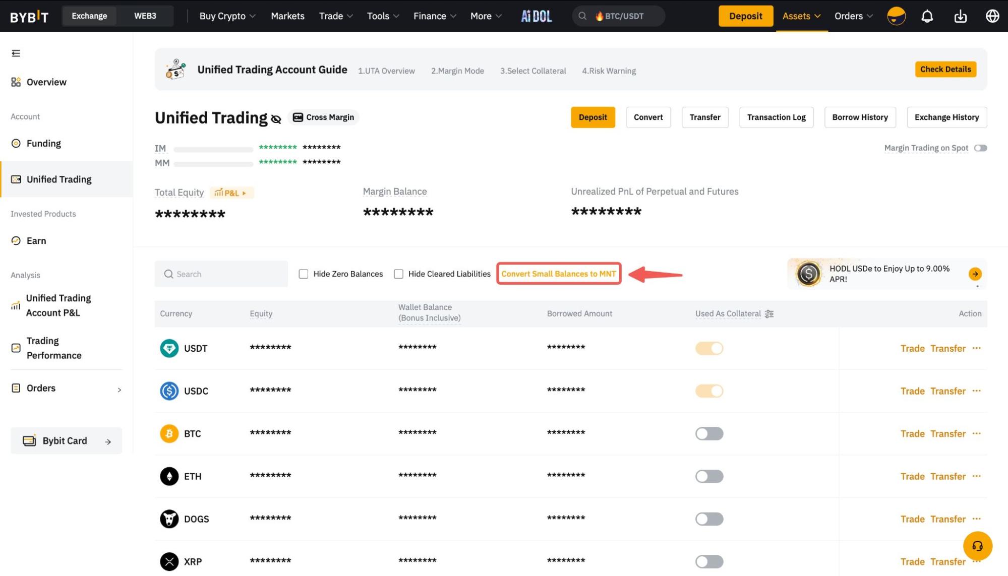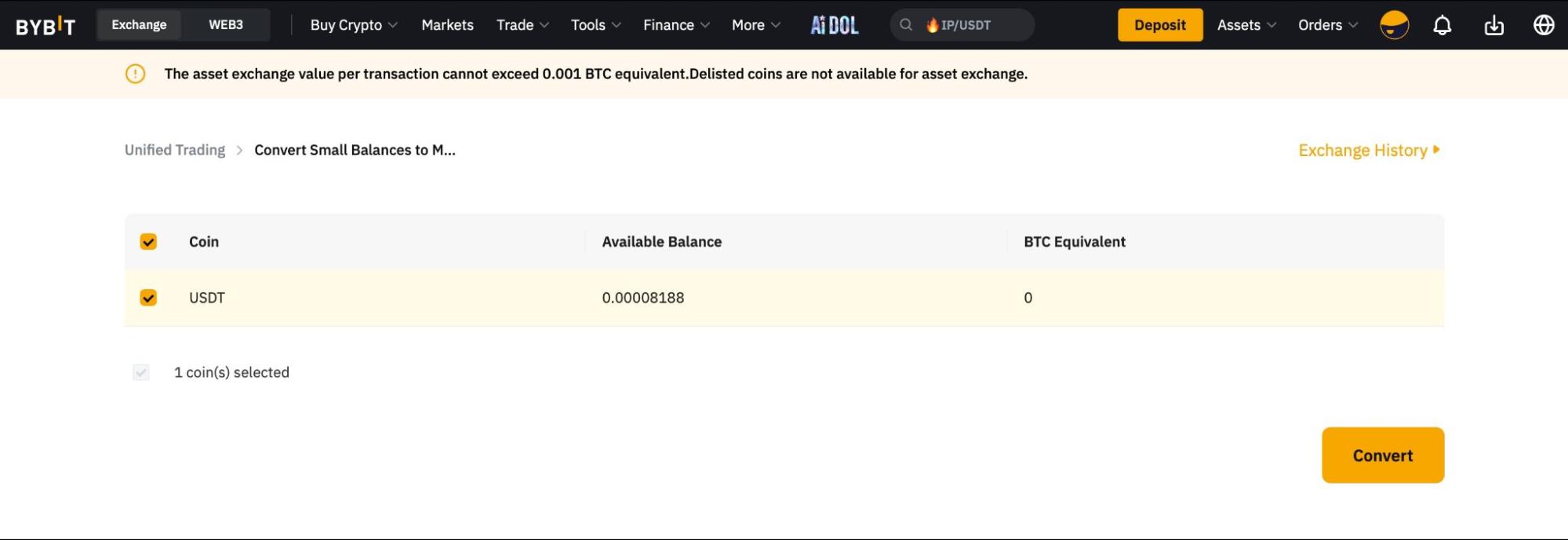 为了提高Bybit帐户中小资产的使用率,您可以透过以下四个简单步骤将价值低于0.001 BTC或等值的任何资产一次性转换为MNT。为了将小额余额转换为 MNT,统一交易帐户 (UTA) 用户需要将资金转移到 UTA。请注意,您可以每六个小时进行一次小额资产转换。