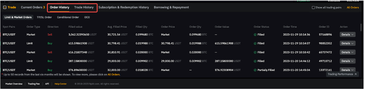您可以在现货交易页面切换订单记录或交易历史选项卡,最多可查看最近 6 个月内的 50 条记录。与当前订单类似,您可以勾选显示全部交易对框,即可查看所有交易对的订单记录或交易历史。