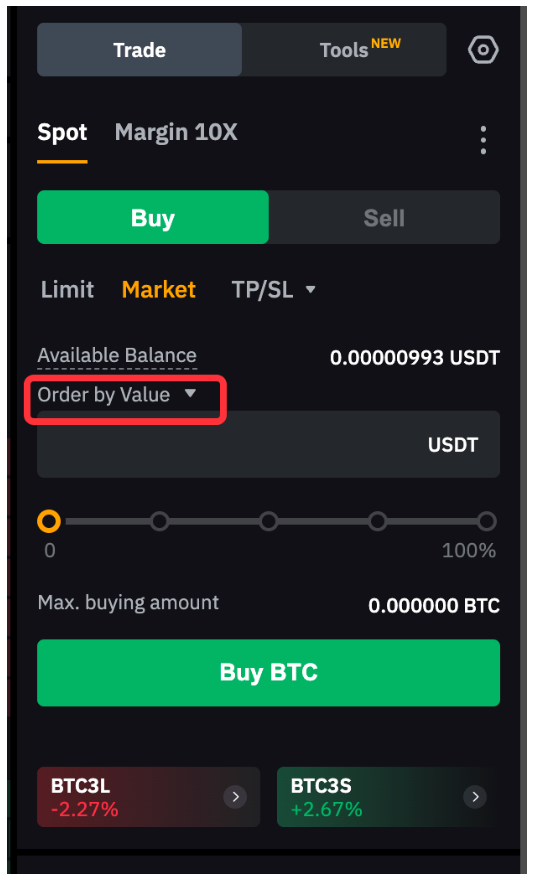请注意:如果您选择将所有可用余额用于下单市价买入或市价卖出,实际显示的最大金额或数量可能会与系统计算的金额或数量存在细微差异。该差异能有效缓冲潜在的市场价格变化,确保即使价格略有波动,您也能顺利下单。