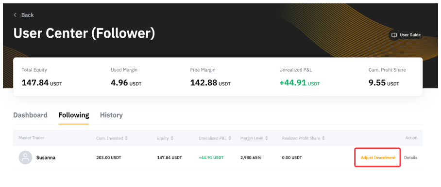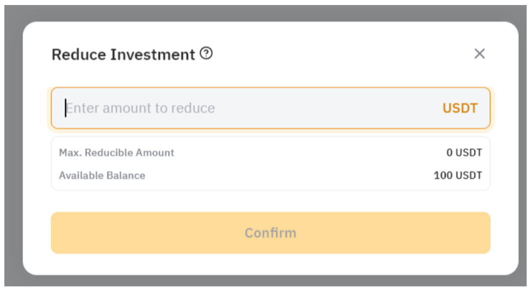 第 1 步:进入跟单用户中心 → 跟单中 → 调整投资额。然后,点击追加投资额减少投资额。减少投资额的请求一旦提交,则无法撤销。