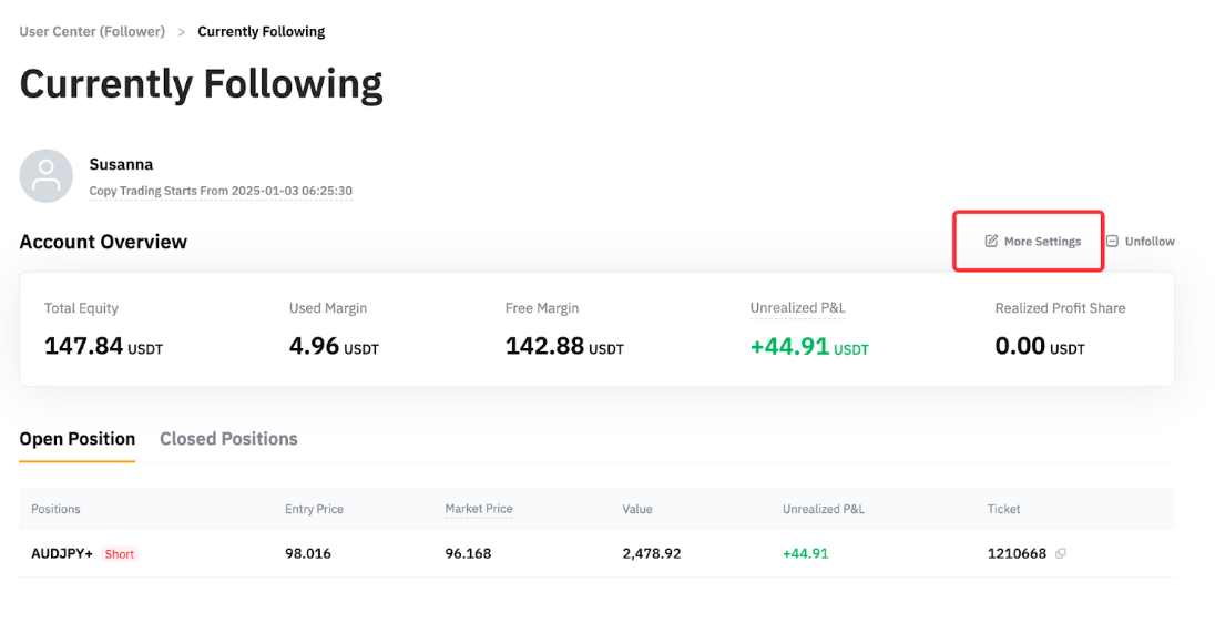 第 3 步:前往当前跟单页面,点击更多设置。您可以更新止盈和止损额,然后点击修改跟单参数