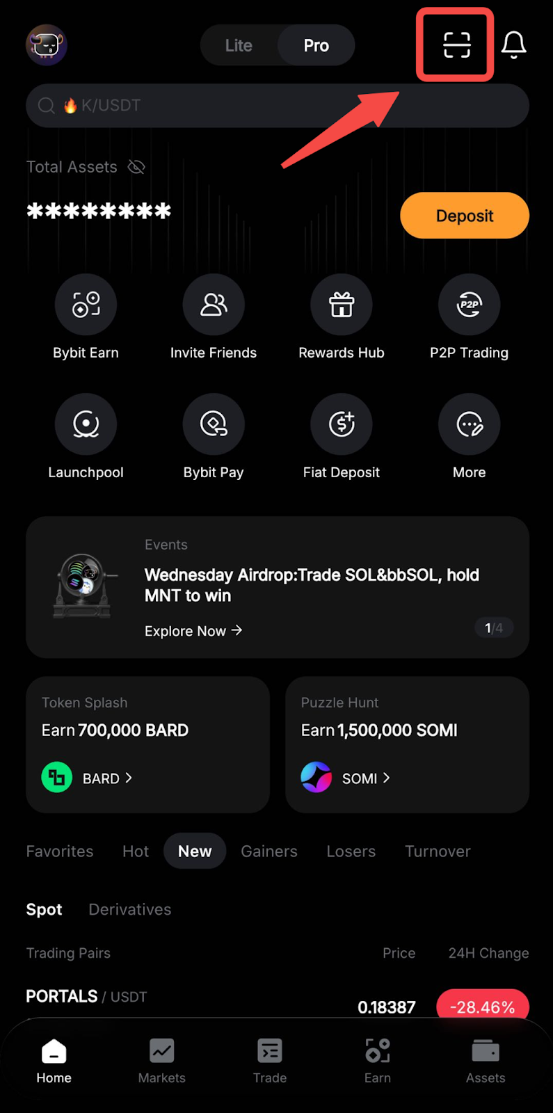 Step 1: From the Bybit homepage, tap on the Scanner icon to open the QR scanner.