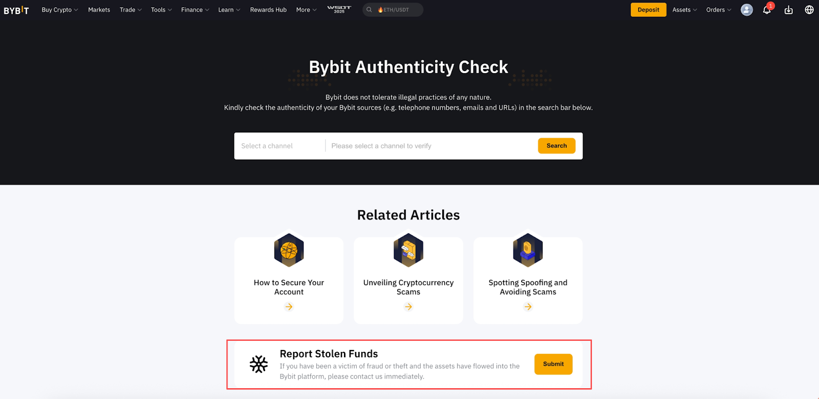 访问 Bybit 官方验证通道页面,点击举报资金被盗区域的提交按钮。