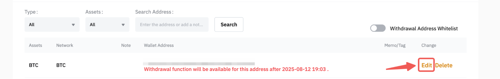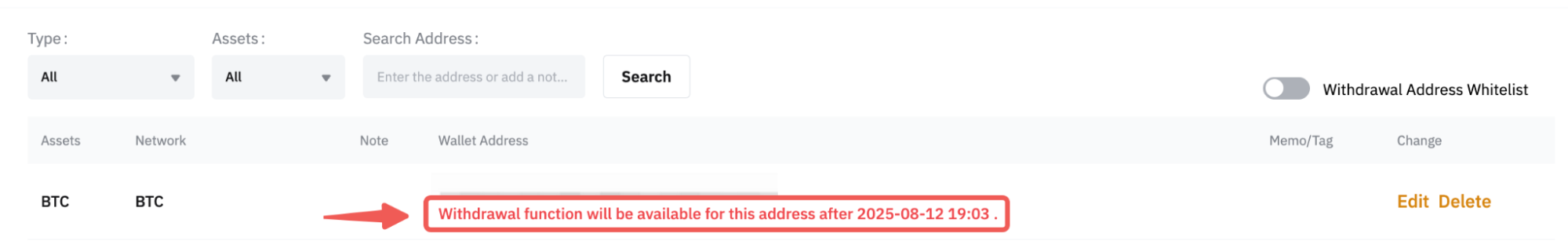 例如,如果您启用了新增地址提币限制安全功能,则新保存地址的提币功能将被限制24 小时,禁用此功能后也会触发24 小时限制。