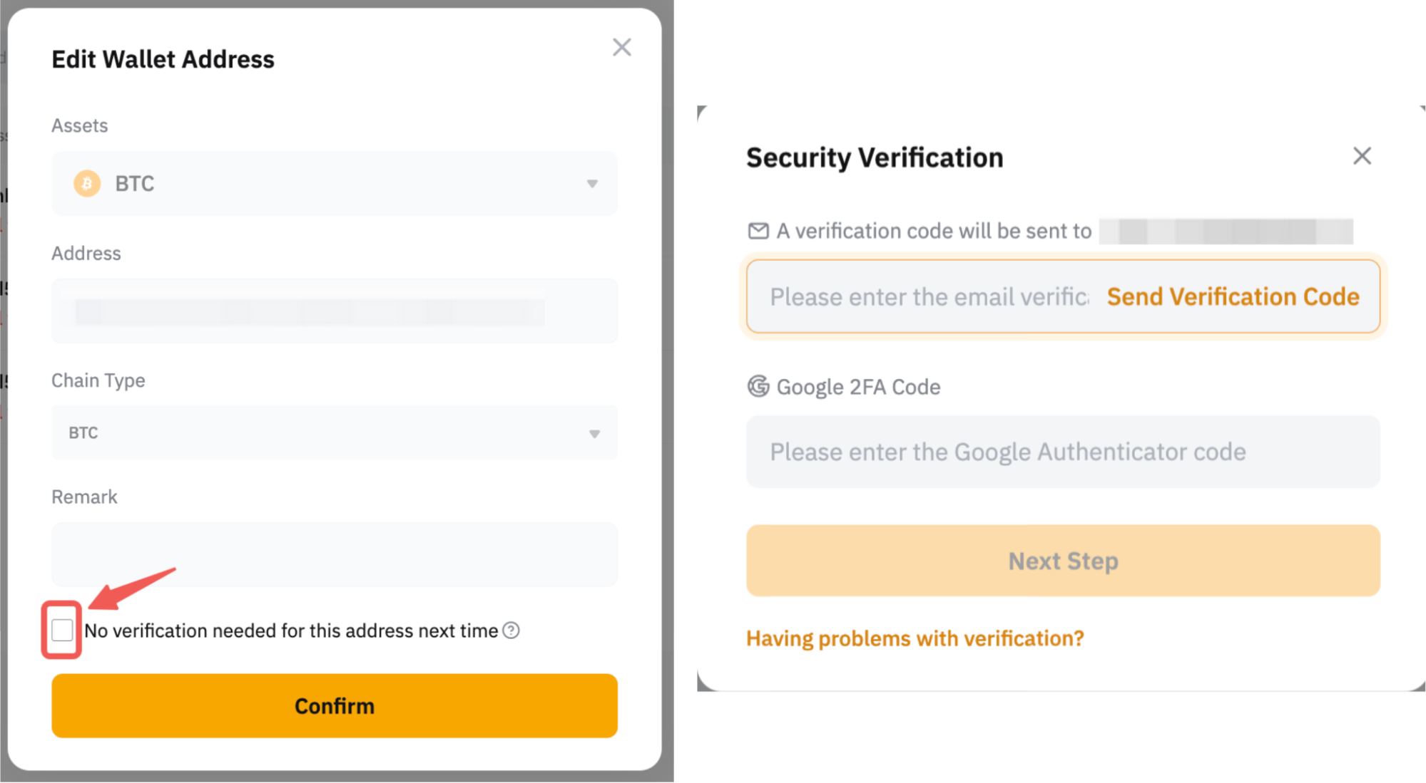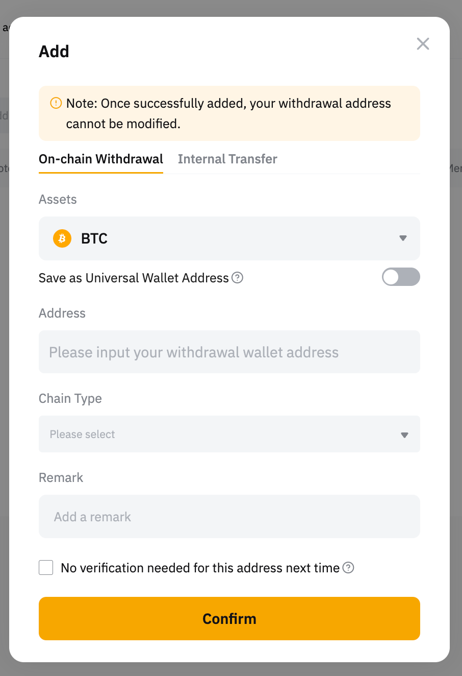 如果要启用另存为通用钱包地址或下次不需要验证该地址功能,请选中下面的框。但是,请注意,如果在您的帐户中检测到任何异常活动,也可能需要进行安全验证。