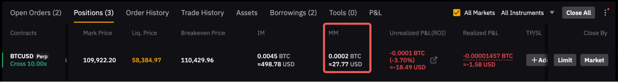 您会注意到,由于仓位选项卡显示的 MM 包含平仓预估费用,因此 MM 会更高。
