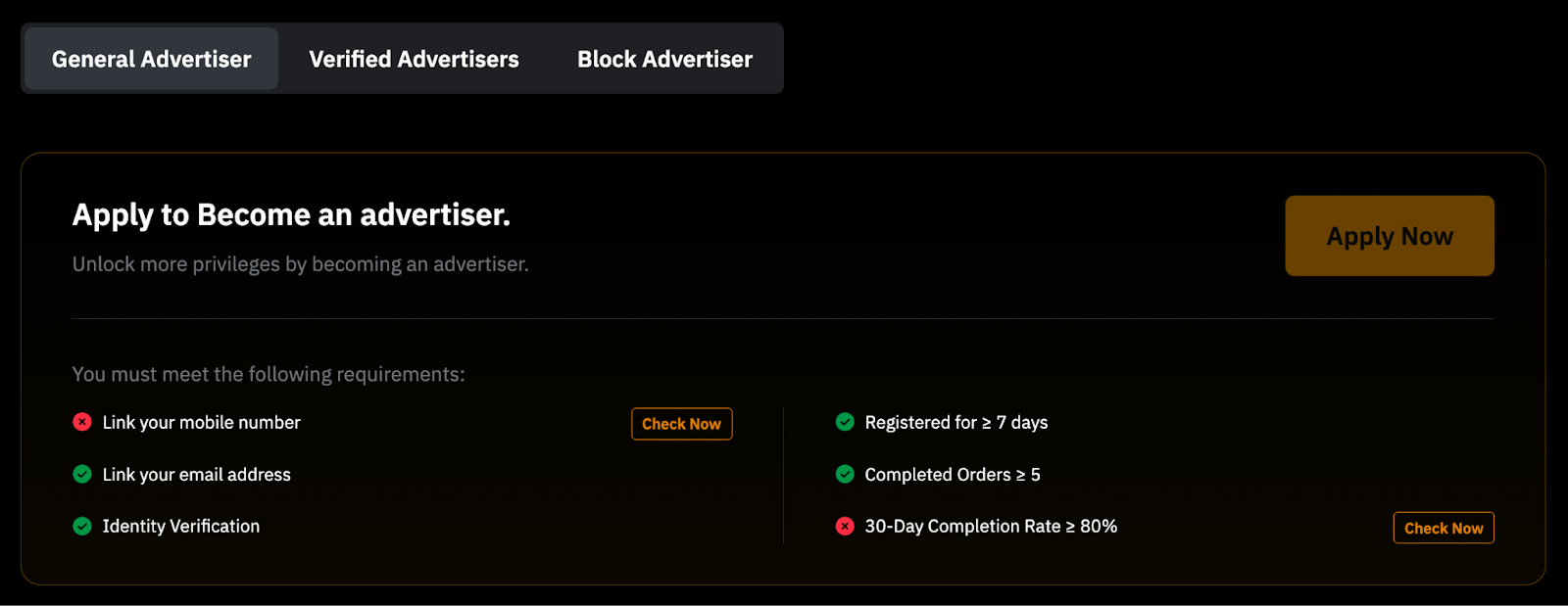 要成为认证广告方或大宗广告方,您可以前往 P2P 广告方申请 页面查看相应的要求并申请成为认证或大宗广告方。