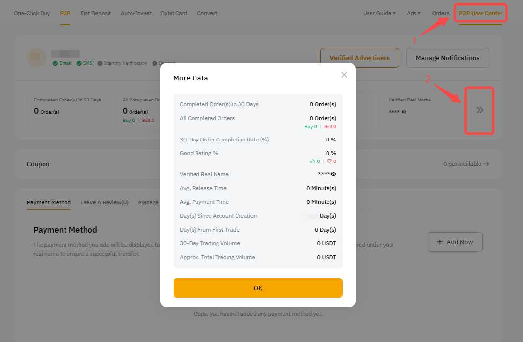 要查看您是否符合普通广告商的其中一个等级,请点击 P2P 用户中心,然后点击网站上的 2 个右箭头图标,查询您的 P2P 交易账户数据。