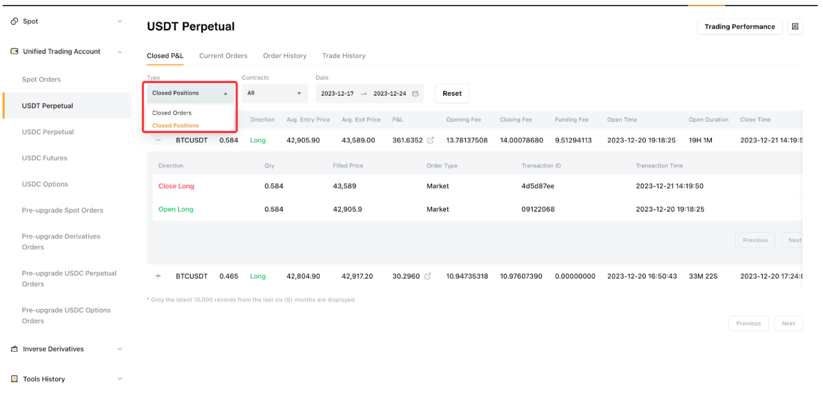 1) 平仓盈亏历史记录中,显示的是平仓后计入手续费后仓位的最终盈亏。 您可以看到两种类型的平仓盈亏:平仓仓位和平仓订单。