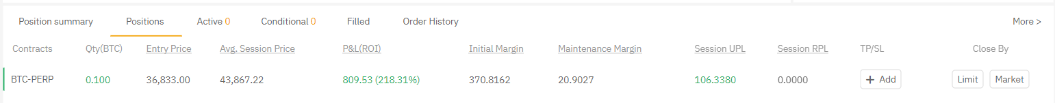 另外,您可以在持倉區查看您的訂單詳情,其中包括您的倉位概覽,倉位,活動單,條件單,已成交訂單以及訂單歷史。